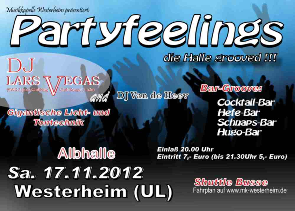 Die nächste Auflage der „Party Feelings“ – Reihe findet am Sa. 17.11.2012 in Westerheim(UL) in der Albhalle statt. Grosser Ground Support, Quattro Beschallung, viel Licht und sicherlich ein volles Haus garantiert.